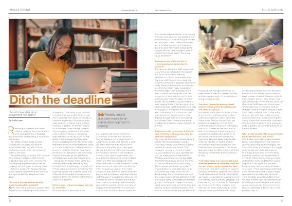 What were some of the benefits of removing assignments due days for lecturers ? We care a lot about the staff experience . Many times we focused on the student and what the students learning experience is . But of course we know that how staff interact has a really big outcome on how the students experience study . Some of the benefits for lecturers was that they often really cared about the wellbeing of their students , and if their students are doing well , that can bring a lot of work satisfaction for staff , but it can also mean flexibility for them as well . We found they could moderate peak loading times . It did also give some benefits to team teaching and sharing that workload out . And some of the lecturers who participated in the study said that marking one off assignments as they dripped through was far more relaxing and allowed them to give more good feedback as it wasn ’ t a huge onslaught all at once .