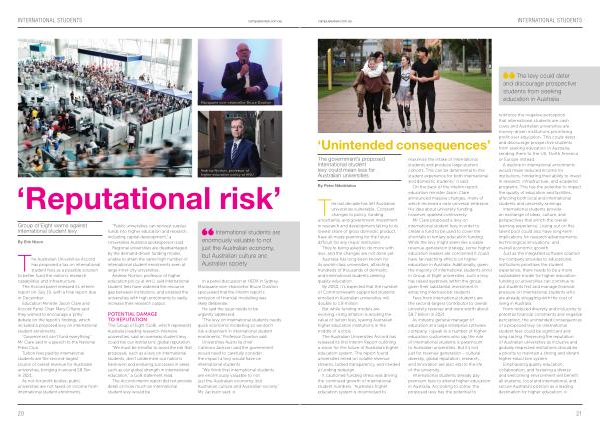 The Group of Eight ( Go8 ), which represents Australia ’ s leading research-intensive universities , said an overseas student levy could risk our institutions ’ global reputation .