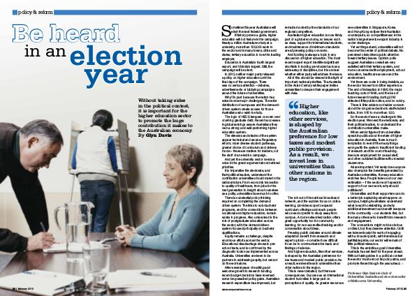 This is the ambitious goal Universities Australia has set itself for the year ahead. Without taking sides in a political contest the sector must set out its policy aims, and promote these through the year ahead. ■