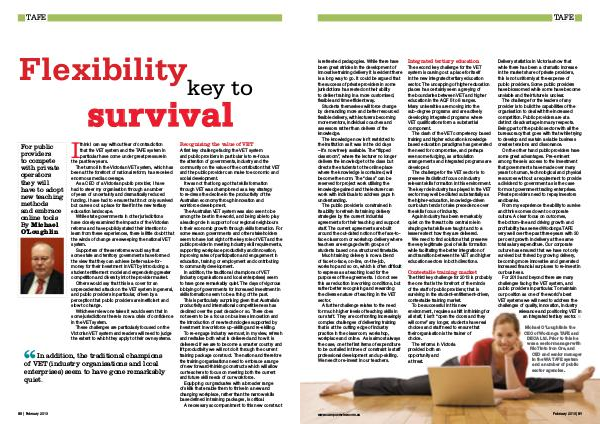 For 2013 and beyond there are many challenges facing the VET system, and public providers in particular. To maintain our position as one of the world’ s best VET systems we will need to address the challenges of quality, innovation, industry relevance and positioning VET in an integrated tertiary sector. ■