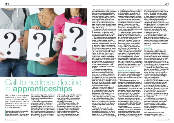 SOLUTIONS Lambert calls for“ urgent clarity on the apprenticeship and traineeship policy” and wants to send this message to the new federal government:“ The number one request we have is can we get some clarity from you about whether you support trade and non-trade apprenticeships? Do you think they are sound policy instruments for achieving skill development and successful school transitions? And if the answer is yes, how do we get them going again?”