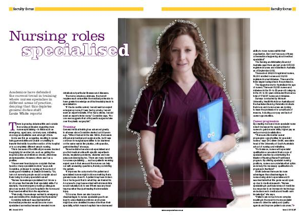 There is growing debate within and outside the nursing profession regarding more nurses specialising – in fields such as emergency, aged care, coronary care, midwifery, oncology and palliative care amongst others. Some see this as a negative, resulting in nurses losing general skills and unable or unwilling to transfer their skills to another section of the hospital or to a completely different area in nursing.