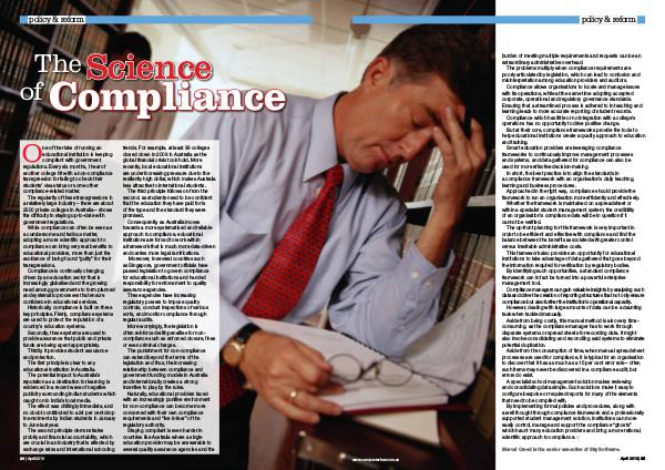 By implementing formal policies and procedures, along with a well thought through compliance framework and a professionally supported student management solution, institutions can more easily control, manage and support the compliance“ ghosts” which haunt many education providers and bring a more rational, scientific approach to compliance. n