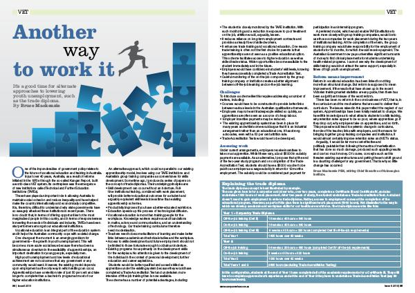 • Existing programs focus primarily on the development skills for the workplace. No attention is given to the development of the individual in the context of personal development, further education and career aspirations. Students would be better qualified and as well skilled as apprentices under the existing system because they would have completed a Trade Accreditation Test and undertaken more intensive off-the-job training than is now available. The scheme has a number of potential advantages, including: