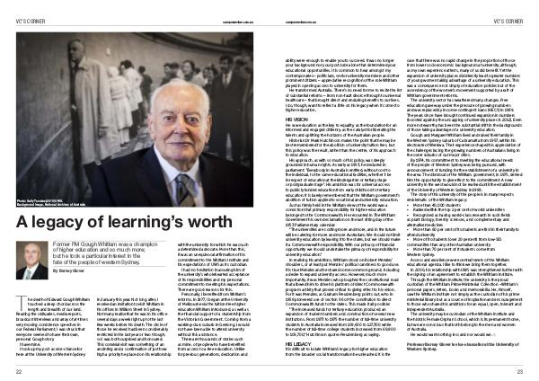 The death of Edward Gough Whitlam touched a deep chord across the length and breadth of our land. Reading the obituaries, media reports, broadcast interviews and array of at-times very moving condolence speeches in our Federal Parliament, I was struck that everyone seemed to have their own, personal Gough story. I have mine. I took up my post as vice-chancellor here at the University of Western Sydney in January this year. Not long after, I received an invitation to visit Whitlam in his offices in William Street in Sydney. Not many realise that he was in his office several days a week right up to the last few weeks before his death. The circle of those he received had been considerably restricted in the last year or two though, so I was both surprised and honoured. This convivial visit was something of an anointing and a confirmation of just how high a priority he placed on his relationship with the university for which he was such a determined advocate. More than this, it was an unequivocal affirmation of his commitment to the Whitlam Institute and his expectations of UWS as its custodian.