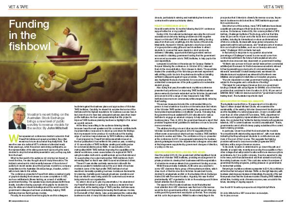 NEW PROVIDER IMITATES LEADING TAFE MODEL Over the period 2011 – 13, the government shifted significant funds away from Victorian TAFE institutes, providing encouragement for private providers to develop their businesses with the expectation of a handsome revenue stream from government funding sources. Whilst it was probably inevitable, it still came as a surprise to some VET observers that a group of three private providers, which drew much of their income from Victorian Government funds, decided to amalgamate and list on the Australian Stock Exchange in late 2013 with the name Vocation. Arguably, this was the first predominantly VET organisation to list on the exchange and it drew instant attention from the sector.
