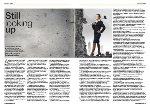 Fitzgerald was somewhat more supportive of quotas, saying,“[ They ] work well if there is an institutional culture that sees quotas as philosophically important.” But she says it should be more about getting the balance right.“ Gender balance is really important, so as well as getting women into senior management, it’ s also important to look across the university and say,‘ Are there some departments where there’ s an absence of men in leadership roles?’” ■