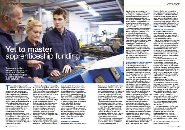 “ My gut feeling is that if you look back from July 1 next year, 2015, all sorts of funding regimes will have coalesced and we’ ll know a lot more than we do now as to what this minister and department have planned, not only for the funding of employers taking apprentices but for the actual provision of services to both employers and apprentices and trainees. What we saw in the Budget was probably only the first of many steps to be announced.”