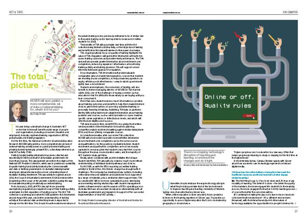 For NCVER, as with the RTOs reporting accredited training activity for the first time, this historic change has brought with it challenges. The company has developed new systems, including online data entry and validation and submission tools supported by a range of materials, plus a dedicated client support team. This has enabled NCVER to be more outwardly focused, developing and cementing existing relationships with student management system software vendors and thousands of RTOs operating across Australia. We have also worked closely and collaboratively with all Australian governments and regulators in support of the successful implementation of total VET activity. n