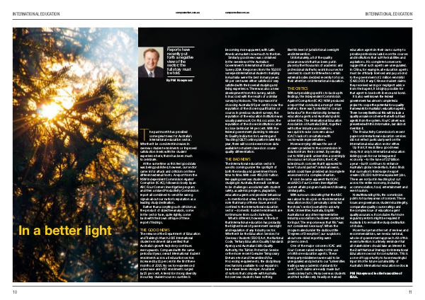 More than yet another set of reviews and recommendations, we need a national, whole-of-government approach. All of this recent attention is a timely reminder that all stakeholders should take an interest in the Draft National Strategy for International Education now out for consultation. This is a one-off opportunity to have meaningful input into the future sustainability of Australia’ s international education sector. n