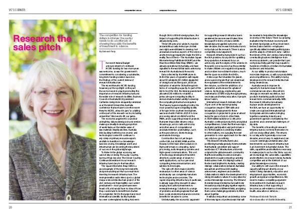 Our ability to self-source this research capacity will impact directly on our nation’ s living standards, education and employment opportunities, economic growth and global competitiveness. We need to make a compelling argument for investment in Australia’ s research infrastructure, so that supporting it becomes as self-evident as investing in health, education or defence. n