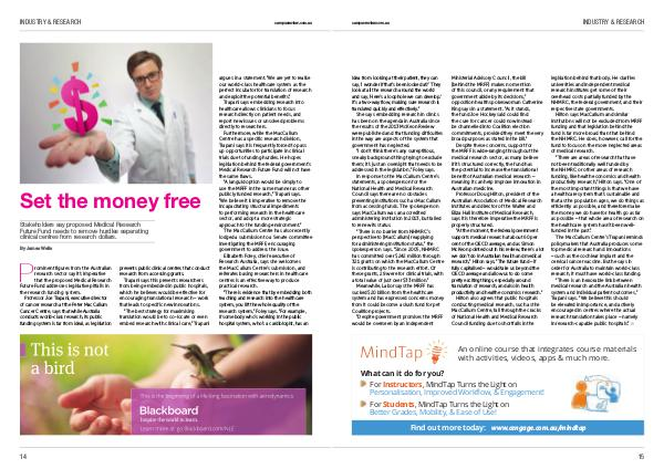 The MacCallum Centre’ s Trapani reminds policymakers that Australia produces some top medical research and innovations – such as the cochlear implant and the cervical cancer vaccine. But he says in order for Australia to maintain world-class research, it must have world-class funding.“ There is an inexorable link between medical research and the Australian health system and individual patient outcomes,” Trapani says.“ We believe this should be elevated in importance, and actively encouraged in centres where the actual research translation takes place – namely in research-capable public hospitals.” ■