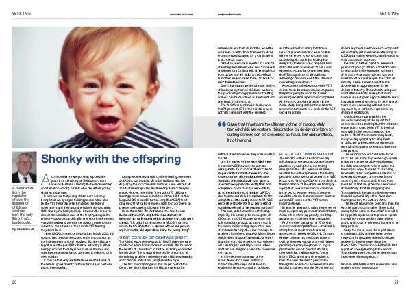 RELAX, IT’ S A COMMON PROBLEM The report’ s authors tried to downplay this alarming revelation about assessment practices by saying the same finding emerged in the 2013 aged-care review and that the authority believes the finding probably holds true for all programs in VET. It was ham-fisted by ASQA to try to diminish the importance of the childcare finding by saying that poor assessment is common in the sector. A more honest statement would have been that assessment practice across VET is so poor the VET system is dysfunctional.