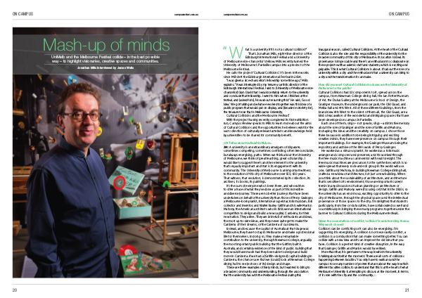 “ I was given a vice-chancellor’ s fellowship some time ago,” Mills explains.“ It was interrupted by my tenure as artistic director of the Edinburgh International Festival. I said to [ University of Melbourne vicechancellor ] Glyn Davis that I would certainly return to the university and conclude that fellowship. I went to him when I finished at the festival, and [ asked him ],‘ How about resuming this?’ He said,‘ Good idea.’ We got talking and what we evolved together was this idea of a public program that would put on display, and [ broaden notoriety for ], the treasure trove that is Melbourne University, Cultural Collisions and the Melbourne Festival.” With the project having recently completed its first exhibition run, Campus Review speaks to Mills to learn more about the aims of Cultural Collisions and the opportunities he believes exist for the vast collection of culturally relevant artefacts and knowledge held by universities to be shared for community benefit.