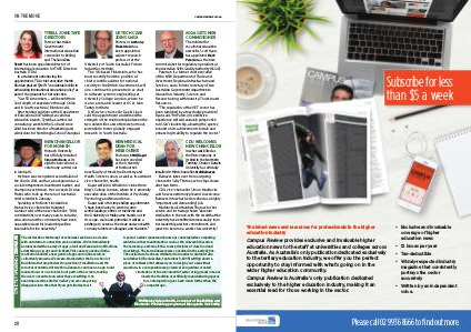 Subscribe for less than $5 a week The latest news and resources for professionals in the higher education industry Campus Review provides exclusive and invaluable higher education news to the staff at universities and colleges across Australia. As Australia’s only publication dedicated exclusively to the tertiary education industry, we offer you the perfect opportunity to stay informed with what’s going on in the wider higher education community. Campus Review is Australia’s only publication dedicated exclusively to the higher education industry, making it an essential read for those working in the sector. • Exclusive and invaluable coverage of higher education news • 12 issues per year • Tax-deductible • Widely-respected industry magazine that consistently portrays the sector accurately • Written by an independent voice. Please call 02 9936 8666 to find out more.