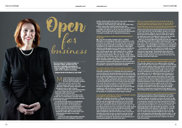 What other important issues do you think UA should be focussing on? Alongside the generation of ideas and growth, the other thing that’ s really important is the need for universities to be open to talent from whatever circumstance it comes. We need to be able to offer the benefits of university education to people irrespective of circumstance. And that’ s also an important part of the mission. It’ s important that university is able to be accessed by people who might otherwise have difficulty accessing it because of the way disadvantage impacts either their initial opportunities, or the way disadvantage affects their ability just to participate in a university education. I think that’ s another thing that we have to strongly focus on. We are very lucky that Australia has a very strong and open, and independent, and high quality university system. So we have to pay attention to that system being able to encompass all those who can benefit, because it won’ t continue to be strong unless it does that. ■