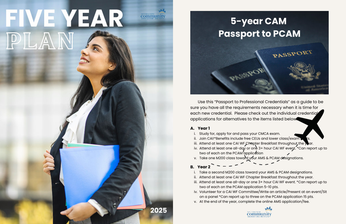 A. Year 1 i. Study for, apply for and pass your CMCA exam. ii. Join CAI!* Benefits include free CEUs and lower class / exam costs. iii. Attend at least one CAI WF Chapter Breakfast throughout the year. iv. Attend at least one all-day or one 3 + hour CAI WF event. * Can report up to two of each on the PCAM application v. Take one M200 class toward your AMS & PCAM designations.