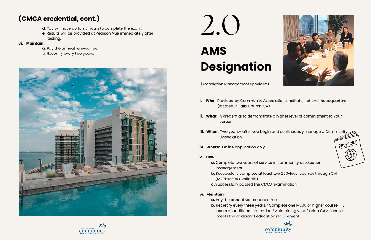 v. How: a. Complete two years of service in community association management b. Successfully complete at least two 200-level courses through CAI