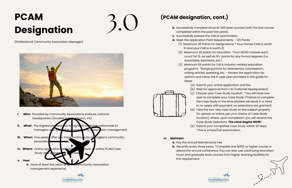 ( 3) Minimum 55 points for CAI & industry-related education programs * Ranging points for attendance, volunteerism, writing articles, speaking, etc.- Review the application for options and follow the 5-year plan provided in this guide for ideas.( a) Submit your online application and fee.( b) Wait for approval from CAI( national headquarters)( c) Choose your Case Study location * You will have one year to complete your Case Study(* Failure to complete the Case Study in the time allotted will result in a need to re-apply with payment; no extensions are granted)