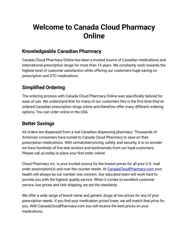 Canada Cloud Pharmacy Online has been a trusted source of Canadian medications and International prescription drugs for more than 15 years . We constantly work towards the highest level of customer satisfaction while offering our customers huge saving on prescription and OTC medications .