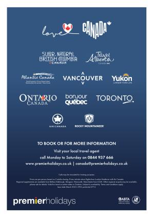 TO BOOK OR FOR MORE INFORMATION Visit your local travel agent call Monday to Saturday on 0844 937 666 www . premierholidays . co . uk | canada @ premierholidays . co . uk