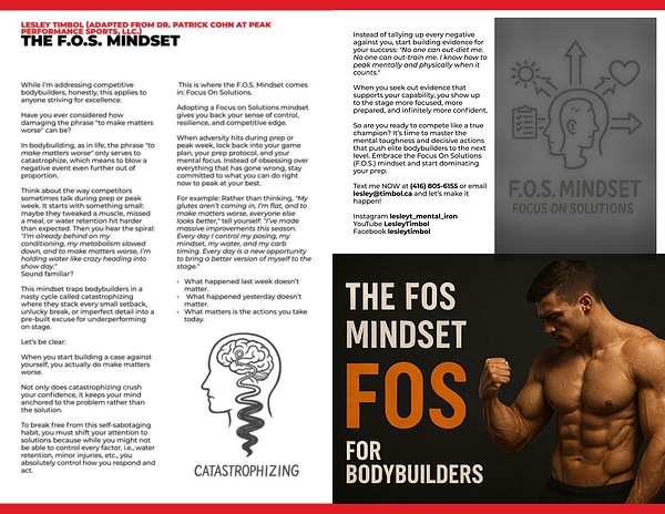 Think about the way competitors sometimes talk during prep or peak week. It starts with something small: maybe they tweaked a muscle, missed a meal, or water retention hit harder than expected. Then you hear the spiral: " I’ m already behind on my conditioning, my metabolism slowed down, and to make matters worse, I’ m holding water like crazy heading into show day." Sound familiar?