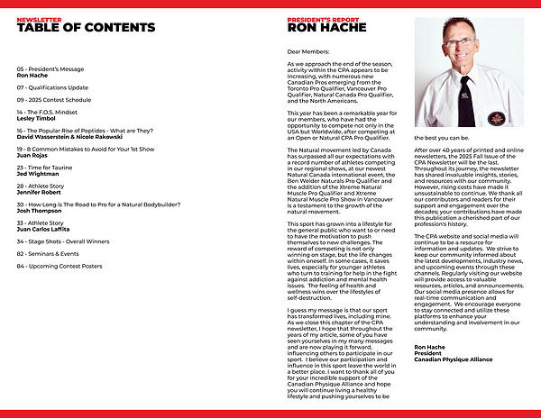 I guess my message is that our sport has transformed lives, including mine. As we close this chapter of the CPA newsletter, I hope that throughout the years of my article, some of you have seen yourselves in my many messages and are now playing it forward, influencing others to participate in our sport. I believe our participation and influence in this sport leave the world in a better place. I want to thank all of you for your incredible support of the Canadian Physique Alliance and hope you will continue living a healthy lifestyle and pushing yourselves to be the best you can be.