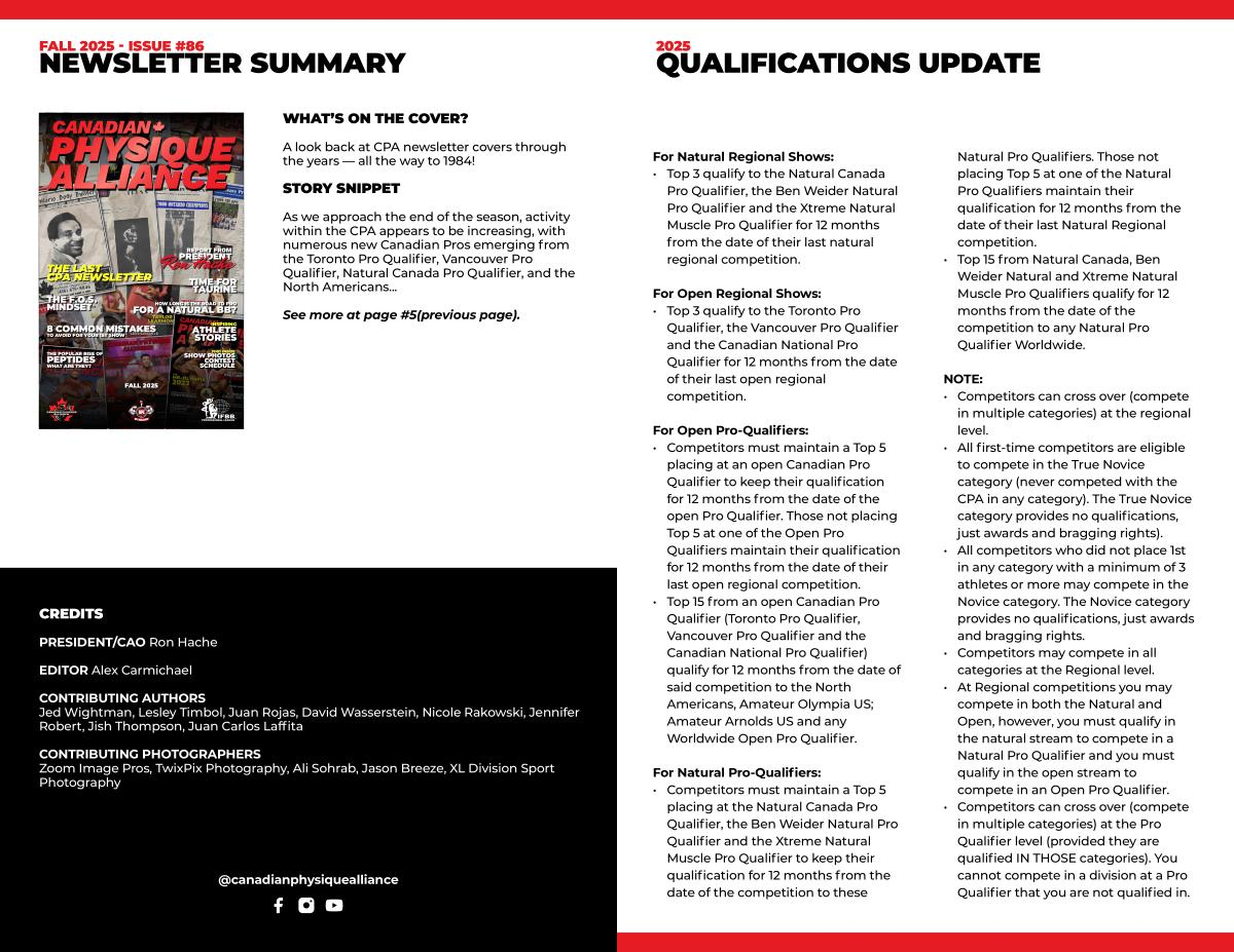 As we approach the end of the season, activity within the CPA appears to be increasing, with numerous new Canadian Pros emerging from the Toronto Pro Qualifier, Vancouver Pro Qualifier, Natural Canada Pro Qualifier, and the North Americans...