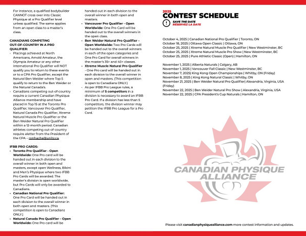 • Canadians competing out-of-country require a current Canadian Physique Alliance membership and have placed in Top 15 at the Toronto Pro Qualifier, Vancouver Pro Qualifier, Natural Canada Pro Qualifier, Xtreme Natural Muscle Pro Qualifier or the Ben Weider Natural Pro Qualifier within a 12-month period. Canadian athletes competing out-of-country require aletter from the President of the CPA – ronhache @ unitz. ca. handed out in each division to the overall winner in both open and masters.