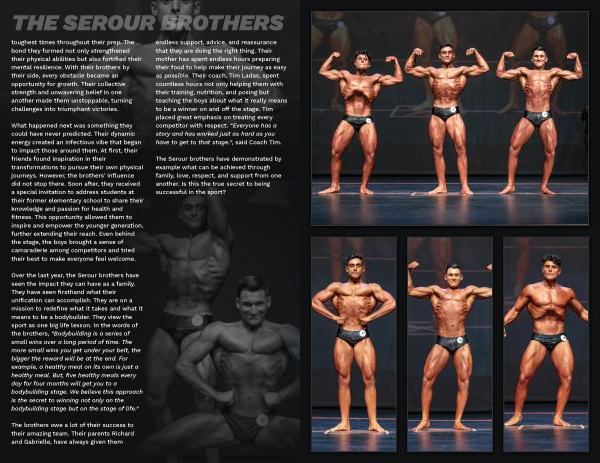 What happened next was something they could have never predicted . Their dynamic energy created an infectious vibe that began to impact those around them . At first , their friends found inspiration in their transformations to pursue their own physical journeys . However , the brothers ' influence did not stop there . Soon after , they received a special invitation to address students at their former elementary school to share their knowledge and passion for health and fitness . This opportunity allowed them to inspire and empower the younger generation , further extending their reach . Even behind the stage , the boys brought a sense of camaraderie among competitors and tried their best to make everyone feel welcome . endless support , advice , and reassurance that they are doing the right thing . Their mother has spent endless hours preparing their food to help make their journey as easy as possible . Their coach , Tim Ladas , spent countless hours not only helping them with their training , nutrition , and posing but teaching the boys about what it really means to be a winner on and off the stage . Tim placed great emphasis on treating every competitor with respect . “ Everyone has a story and has worked just as hard as you have to get to that stage .”, said Coach Tim .