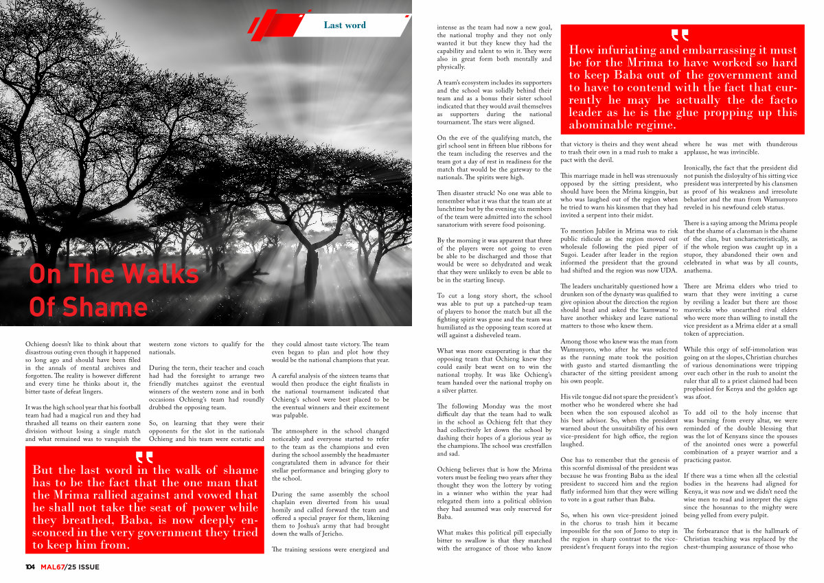 But the last word in the walk of shame has to be the fact that the one man that the Mrima rallied against and vowed that he shall not take the seat of power while they breathed, Baba, is now deeply ensconced in the very government they tried to keep him from. they could almost taste victory. The team even began to plan and plot how they would be the national champions that year.