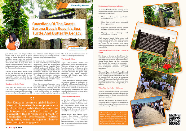 For Kenya to become a global leader in sustainable tourism, it must present tangible, working models that show measurable impact. Serena Beach Resort & Spa exemplifies this through its approach to communityled conservation, cultural integration, waste management innovation, and guest engagement.