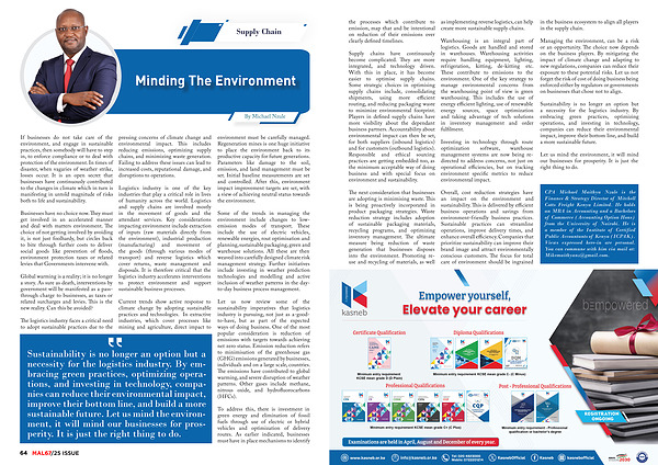 Logistics industry is one of the key industries that play a critical role in lives of humanity across the world. Logistics and supply chains are involved mostly in the movement of goods and the attendant services. Key considerations impacting environment include extraction of inputs( raw materials directly from the environment), industrial production( manufacturing) and movement of the goods( through various modes of transport) and reverse logistics which cover returns, waste management and disposals. It is therefore critical that the logistics industry accelerates interventions to protect environment and support sustainable business processes.