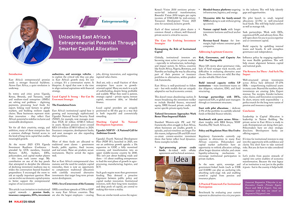 This article is an invitation to institutional capital stewards- pension funds, insurance companies, DFIs, investment authorities, and sovereign vehicles- to explore the critical role they can play in East Africa’ s growth story. It’ s not a critique. It’ s a conversation starter. A blueprint. A signal that now is the time to align national aspirations with financial strategy.