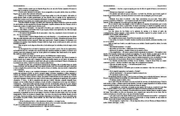 Al día siguiente Jon se levantó al amanecer para ver partir a su tío. Uno de los exploradores, un hombretón muy feo, entonaba una canción indecente mientras ensillaba el caballo y el aliento se le elevaba como una columna de vapor en el aire gélido de la mañana. Ben Stark sonrió al ver aquello. En cambio no sonrió a su sobrino.—¿ Cuántas veces tengo que decirte que no, Jon? Hablaremos cuando regrese. Mientras veía a su tío guiar al caballo hacia el túnel, Jon recordó lo que Tyrion Lannister le había contado en el camino real, e imaginó a Ben Stark tendido muerto, en un charco de sangre roja sobre la nieve. Sólo con pensarlo se sintió fatal. ¿ En qué se estaba convirtiendo? Buscó a Fantasma en la soledad de su celda, y enterró la cara en el espeso pelaje blanco.