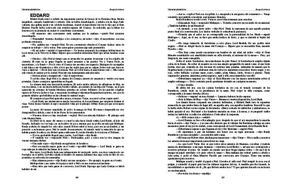 Era cierto. Lord Renly lucía una indumentaria de terciopelo verde, con doce venados de oro bordados en el jubón. Llevaba echada al hombro de manera informal una capa corta de hilo de oro, prendida con un broche de esmeraldas.— Hay crímenes peores— dijo Renly con una carcajada—. Por ejemplo, tu gusto en el vestir. Meñique hizo caso omiso de la puya y miró a Ned con una sonrisa casi insolente.— Hace años que tenía ganas de conoceros, Lord Stark. Supongo que Lady Catelyn os habrá hablado de mí.