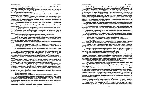 Lo haría, desde luego. Tyrion Lannister siempre cumplía su palabra. Lo que se calló fue el resto: el rey Robert no le haría el menor caso, Lord Tywin le diría que se había vuelto loco, y Jaime se limitaría a reírse.— Sois joven, Tyrion— dijo Mormont—. ¿ Cuántos inviernos habéis vivido?— Ocho o nueve— contestó Tyrion encogiéndose de hombros—, me falla la memoria.— Y todos cortos.— Así es, mi señor.— Había nacido al final de un invierno, un invierno terrible y cruel que según los maestres había durado casi tres años, pero sus primeros recuerdos eran de la primavera.