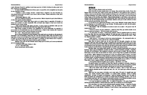 Branden Stark, cuya madre había muerto en el parto. Branden Stark había sido como un hermano mayor para Lord Rickard, el abuelo de Bran, o quizá un hermano pequeño, o hermano del padre de Lord Rickard. Tata cambiaba la historia cada vez que la contaba. En todas ellas, el bebé moría a los tres años de unas fiebres de verano, pero la Vieja Tata se quedaba en Invernalia con sus hijos. Ambos murieron en la guerra en la que el rey Robert subió al trono, y su nieto también cayó ante las murallas de Pyke durante la rebelión de Balón Greyjoy. También sus hijas se habían casado, se habían marchado y habían muerto mucho tiempo atrás. El único descendiente que le quedaba era Hodor, el gigantón retrasado mental que trabajaba en los establos. Y la Vieja Tata vivía, y vivía, y seguía viviendo, con sus labores de costura y sus cuentos.— A mí qué me importa de quién son los cuentos— dijo Bran—. Los odio. No quería cuentos, y no quería a la Vieja Tata. Quería a su madre y a su padre. Quería ir a correr con Verano. Quería trepar por la pared de la torre rota y dar de comer a los cuervos. Quería volver a montar en el poni con sus hermanos. Quería que las cosas fueran como habían sido.