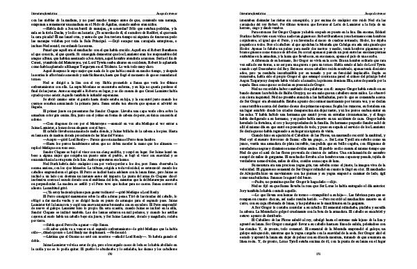 Ned Stark habría dado cualquier cosa por verlos perder a los dos, pero Sansa observaba la escena ansiosa, con los ojos húmedos. La tribuna, erigida a toda velocidad, se estremeció cuando los caballos emprendieron el galope. El Perro se inclinó hacia adelante con la lanza firme, pero Jaime se inclinó a un lado con destreza un instante antes del impacto. La punta del arma de Clegane chocó inofensiva contra el escudo dorado con el emblema del león, mientras que la del Matarreyes acertaba en perpendicular. La madera se astilló y el Perro tuvo que luchar para no caerse. Sansa contuvo el aliento. La multitud gritó.—¡ Ya estoy haciendo planes para gastar tu dinero!— gritó Meñique a Lord Renly. El Perro consiguió mantenerse sobre la silla a duras penas. Tiró de las riendas del caballo, lo obligó a dar media vuelta y se dirigió hacia su punto de arranque para el segundo pase. Jaime Lannister tiró la lanza rota y cogió una nueva mientras bromeaba con su escudero. El Perro emprendió de nuevo el galope. Lannister hizo lo propio. En esta ocasión, cuando Jaime se inclinó en la silla, Sandor Clegane se inclinó también. Las dos lanzas saltaron en mil pedazos, y cuando las astillas cayeron al suelo había un caballo bayo sin jinete, y Ser Jaime Lannister, dorado y magullado, rodaba por tierra.— Sabía que el Perro iba a ganar— dijo Sansa.— Si sabes quién va a vencer en el segundo enfrentamiento— le gritó Meñique que la había oído—, dímelo pronto o Lord Renly me desplumará.— Ned sonrió.— Lástima que el Gnomo no esté con nosotros— añadió Lord Renly—. Yo habría ganado el doble. Jaime Lannister volvía a estar de pie, pero el recargado casco de león se le había abollado en la caída y no se lo podía quitar. El pueblo lo abucheaba y lo señalaba, las damas y los caballeros