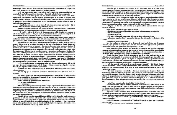 — No crucé las puertas— replicó ella—. Bueno, sí las crucé, pero sin querer. Bajé a las mazmorras, y resultó que había un túnel, estaba todo oscuro y yo no tenía antorcha ni velas, así que tuve que seguir caminando. No podía volver por donde había entrado porque había monstruos. ¡ Padre, hablaban de que querían matarte! Los monstruos no, los dos hombres. Ellos no me vieron porque me quedé quieta como una piedra y silenciosa como una sombra, pero yo los oí. ¡ Dijeron que tenías un libro y un bastardo, y que si una Mano podía morir otra también! ¿ Ése es el libro? ¿ Y el bastardo es Jon?—¿ Jon? Arya, ¿ se puede saber de qué hablas? ¿ Quién dijo eso?— Aquellos hombres— replicó la niña—. Había uno gordo con anillos y barba amarilla de dos puntas, y otro con cota de mallas y casco de acero, y el gordo dijo que tenían que retrasarlo, pero el otro dijo que no podía seguir haciendo juegos malabares, y que el lobo y el león se iban a enfrentar, y que esto ya no era un juego para dos jugadores.— Intentó recordar el resto. No había comprendido todo lo que había oído, y los conceptos se le mezclaban en la cabeza—. El gordo dijo que la princesa estaba preñada. El del casco de acero, que llevaba la antorcha, dijo que tenían que darse prisa. Me parece que era un mago.
