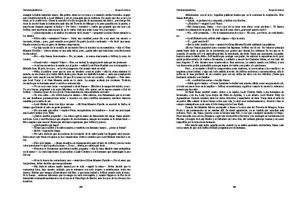 siempre le había inspirado temor. Era gritón, tenía la voz ronca y a menudo estaba borracho, seguro que la habría devuelto a Lord Eddard, y eso si conseguía que la recibiera. De modo que fue a ver a la reina, se lo confió todo. Cersei la escuchó y le dio las gracias de una manera tan dulce... pero luego Ser Arys la escoltó hasta la habitación más alta del Torreón de Maegor y le puso guardias en la puerta, y unas horas después empezó la lucha—. Por favor— terminó—, tenéis que permitir que me case con Joffrey, seré una buena esposa para él, ya lo veréis. Seré una reina como vos, lo prometo.