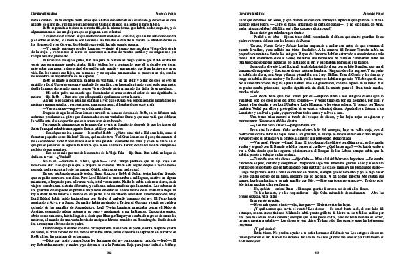 A Bran se le hicieron agua las entrañas al ver que el Gran Jon se ponía en pie lamiéndose los muñones ensangrentados... pero entonces, para su sorpresa, el hombretón se echó a reír.— Vuestra carne— rugió— es jodidamente dura. Después de aquello el Gran Jon se convirtió en la mano derecha de Robb, en su defensor más acérrimo, proclamaba a gritos que el muchacho era un verdadero Stark, y que más valía que doblaran la rodilla ante él si no querían que se la arrancaran de un bocado.