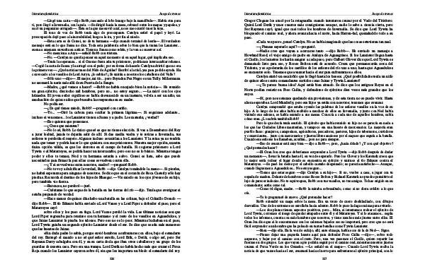 — Esta carta es de Cersei, no de tu hermana— dijo cuando terminó de leerla—. El verdadero mensaje está en lo que Sansa no dice. Toda esta palabrería sobre lo bien que la tratan los Lannister... suena a amenaza envuelta en azúcar. Tienen a Sansa como rehén, y la van a conservar así.— No menciona a Arya— señaló Robb con tristeza.— No.— Catelyn no quería pensar en aquel momento ni en aquel lugar, qué implicaba eso.— Tenía la esperanza... si el Gnomo fuera aún tu prisionero, podríamos intercambiar rehenes.— Cogió la carta de Sansa y la arrugó con el puño; por su forma de hacerlo Catelyn advirtió que no era la primera vez—. ¿ Qué noticias traes del Nido de Águilas? Escribí a la tía Lysa para pedirle ayuda. Ha convocado a los vasallos de Lord Arryn, ¿ lo sabías? ¿ Se unirán a nosotros los caballeros del Valle?