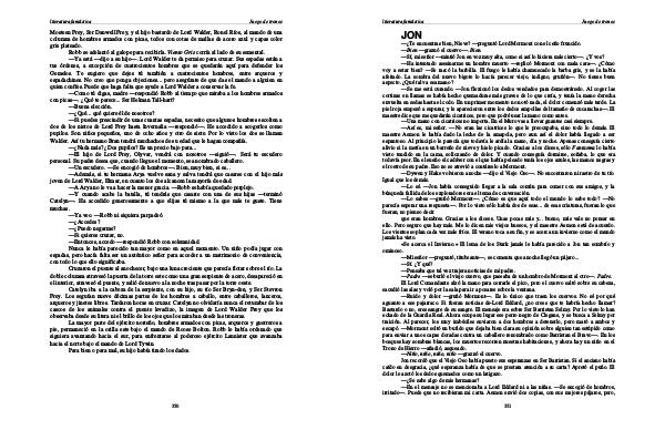 — Como tú digas, madre— respondió Robb al tiempo que miraba a los hombres armados con picas—. ¿ Qué te parece... Ser Helman Tall-hart?— Buena elección.—¿ Qué... qué quiere él de nosotros?— Si puedes prescindir de unas cuantas espadas, necesito que algunos hombres escolten a dos de los nietos de Lord Frey hasta Invernalia— respondió—. He accedido a acogerlos como pupilos. Son niños pequeños, uno de ocho años y otro de siete. Por lo visto los dos se llaman Walder. Así tu hermano Bran tendrá muchachos de su edad que le hagan compañía.—¿ Nada más? ¿ Dos pupilos? Es un precio bajo para...— El hijo de Lord Frey, Olyvar, vendrá con nosotros— siguió—. Será tu escudero personal. Su padre desea que, cuando llegue el momento, sea nombrado caballero.— Un escudero.— Se encogió de hombros—. Bien, muy bien, si es...— Además, si tu hermana Arya vuelve sana y salva tendrá que casarse con el hijo más joven de Lord Walder, Elmar, en cuanto los dos alcancen la mayoría de edad.— A Arya no le va a hacer la menor gracia.— Robb se había quedado perplejo.— Y cuando acabe la batalla, tú tendrás que casarte con una de sus hijas— terminó Catelyn—. Ha accedido generosamente a que elijas tú mismo a la que más te guste. Tiene muchas.— Ya veo.— Robb ni siquiera parpadeó.—¿ Accedes?—¿ Puedo negarme?— Si quieres cruzar, no.— Entonces, accedo— respondió Robb con solemnidad. Nunca le había parecido tan mayor como en aquel momento. Un niño podía jugar con espadas, pero hacía falta ser un auténtico señor para acceder a un matrimonio de conveniencia, con todo lo que ello significaba.