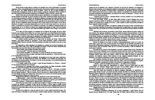 La vanguardia se estaba agrupando a la izquierda. Lo primero que vio fue el estandarte, tres perros negros sobre campo de oro. Bajo él cabalgaba Ser Gregor, a lomos del caballo más grande que Tyrion había visto en su vida. Bronn le echó un vistazo y sonrió.— En la batalla, sigue siempre al hombre más grande.—¿ Y eso por qué?— Tyrion lo miró con el ceño fruncido.— Son un blanco magnífico. Y ese hombre va a atraer las miradas de todos los arqueros.— La verdad es que nunca lo había considerado desde esa perspectiva.— Tyrion se echó a reír, y vio a la Montaña con otros ojos.
