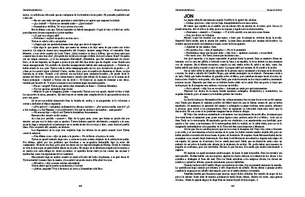 La luz de la luna se derramaba sobre las colinas mientras Jon recoma los recovecos del camino real. Tenía que alejarse lo máximo posible del Muro antes de que se dieran cuenta de que se había marchado. Al amanecer, se apartaría del camino y cabalgaría a campo traviesa, entre prados, arbustos y arroyos, para evitar a los perseguidores. Pero de momento la velocidad tenía más valor que la discreción. No era como si no pudieran imaginar hacia dónde se dirigía.