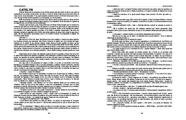 — Un espasmo de dolor lo sacudió y le apretó con fuerza los dedos—. Tengo cangrejos en el vientre... me pellizcan, me pellizcan. Día y noche. Tienen tenazas crueles. El maestre Vyman me da vino de sueño y la leche de la amapola... duermo mucho... pero quería estar despierto para verte cuando llegaras. Tenía miedo... cuando los Lannister cogieron a tu hermano, los campamentos nos rodeaban... tenía miedo de morir antes de volver a verte... tenía miedo...— Ya estoy aquí, padre— dijo ella—. Y también Robb, mi hijo. Él también quiere verte.— Tu hijo— susurró—. Recuerdo que tenía mis ojos...— Los tenía y los tiene. Y te hemos traído prisionero a Jaime Lannister. Aguasdulces vuelve a ser libre, padre.