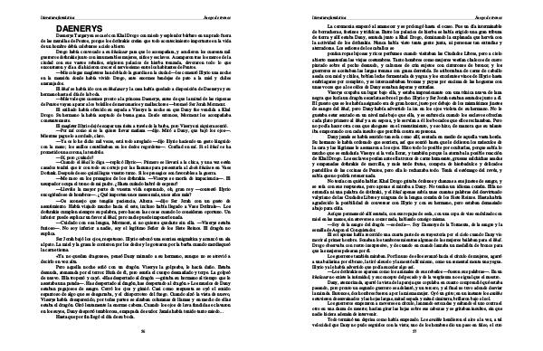 Pero aquella noche soñó con un dragón. Viserys la golpeaba, le hacía daño. Estaba desnuda, atenazada por el terror. Huía de él, pero sentía el cuerpo desmañado y torpe. La golpeó de nuevo. Ella tropezó y cayó. « Has despertado al dragón— gritaba su hermano al tiempo que le asestaba una patada—. Has despertado al dragón, has despertado al dragón.» Los muslos de Dany estaban pegajosos de sangre. Cerró los ojos y gimió. Casi como respuesta se oyó el sonido espantoso de algo que se desgarraba, y el chisporroteo del fuego. Cuando alzó la vista de nuevo, Viserys había desaparecido, por todas partes se alzaban columnas de llamas y en medio de ellas estaba el dragón. Giró lentamente la enorme cabeza. Cuando los ojos de lava fundida se clavaron en los suyos, Dany despertó temblorosa, empapada de sudor. Jamás había tenido tanto miedo...