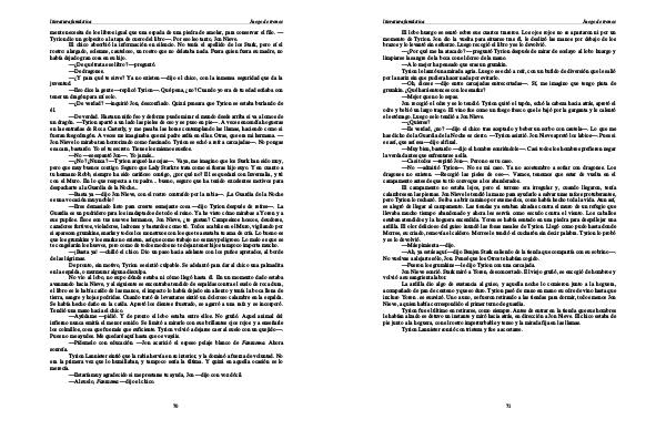 —¿ Por qué me ha atacado?— preguntó Tyrion después de mirar de soslayo al lobo huargo y limpiarse la sangre de la boca con el dorso de la mano.— A lo mejor ha pensado que eras un grumkin. Tyrion le lanzó una mirada agria. Luego se echó a reír, con un bufido de diversión que le salió por la nariz sin que pudiera hacer nada por evitarlo.— Oh, dioses— dijo entre carcajadas entrecortadas—. Sí, me imagino que tengo pinta de grumkin. ¿ Qué hará entonces con los snarks?— Mejor que no lo sepas. Jon recogió el odre y se lo tendió. Tyrion quitó el tapón, echó la cabeza hacia atrás, apretó el odre y bebió un largo trago. El vino fue como un fuego fresco que le bajó por la garganta y le calentó el estómago. Luego se lo tendió a Jon Nieve.—¿ Quieres?— Es verdad, ¿ no?— dijo el chico tras aceptarlo y beber un sorbo con cautela—. Lo que me has dicho de la Guardia de la Noche es cierto.— Tyrion asintió. Jon Nieve apretó los labios—. Pues si es así, que así sea— dijo al final.