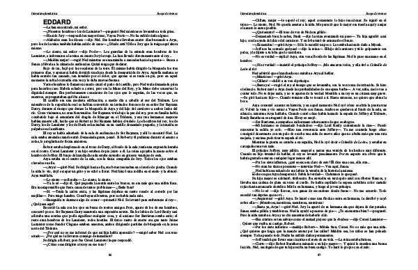 El príncipe Joffrey, muy pálido, empezó a narrar una versión de los hechos muy diferente. Cuando su hijo terminó de hablar, el rey se levantó pesadamente. Por su aspecto era obvio que le habría gustado estar en cualquier lugar menos allí.— Por los siete infiernos, ¿ qué se saca en claro de esto? Él dice una cosa, ella otra...— No eran los únicos presentes— intervino Ned—. Ven aquí, Sansa. __ Ned había escuchado de sus labios la versión de la historia la misma noche en que Arya desapareció. Sabía la verdad—. Cuéntanos lo que pasó. Su hija mayor se adelantó, titubeante. Iba envuelta en terciopelo azul con ribetes blancos, y llevaba una cadena de plata en torno al cuello. Se había cepillado la espesa cabellera color castaño rojizo hasta arrancarle destellos. Miró a su hermana, y luego al joven príncipe.